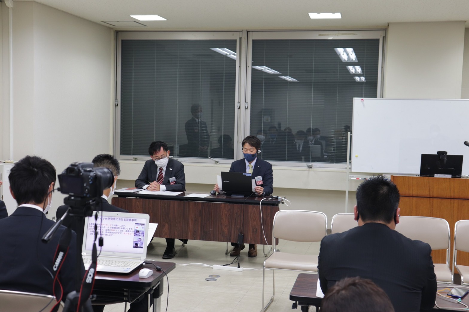 11月16日(火)、防府商工会議所青年部11月度例会で、臨時総会が行われました。9月の臨時総会と同様、新型コロナウイルス感染拡大防止のあめ、オンライン上でミーティングができるウェブ会議システム「Zoom」を用いての開催となりました。防府商工会議所4階研修室に役員、総務研修委員会が集まって運営し、他の青年部メンバーはオンライン出席でした。